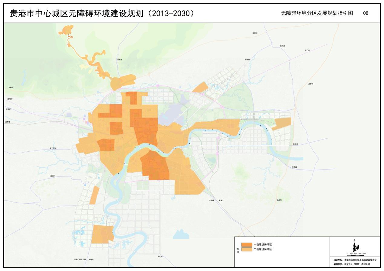以城市发展需求、主要受益群体规模及出行特征以及无障碍环境需求层次分析为前提,通过对无障碍活动载体的识别和发生区域的判断,规划提出一级建设保障区、二级建设保障区两大发展分区,其中,一级建设保障区主要包括中山路、仙衣路、金港大道、迎宾大道两侧的中心区、主要枢纽门户地区,是贵港市无障碍环境建设的示范带动区域,在无障碍环境建设工作中应考虑优先重点推进;二级建设保障区为包括除一级建设保障区以外的规划建设区,应协同逐步推进无障碍环境建设。