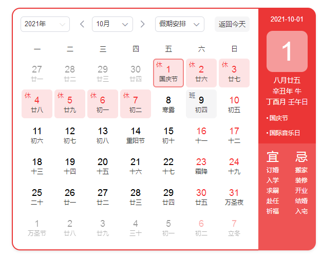 根据《国务院办公厅关于2021年部分节假日安排的通知》精神,并结合公司实际情况,经研究决定,2021年国庆放假安排如下: